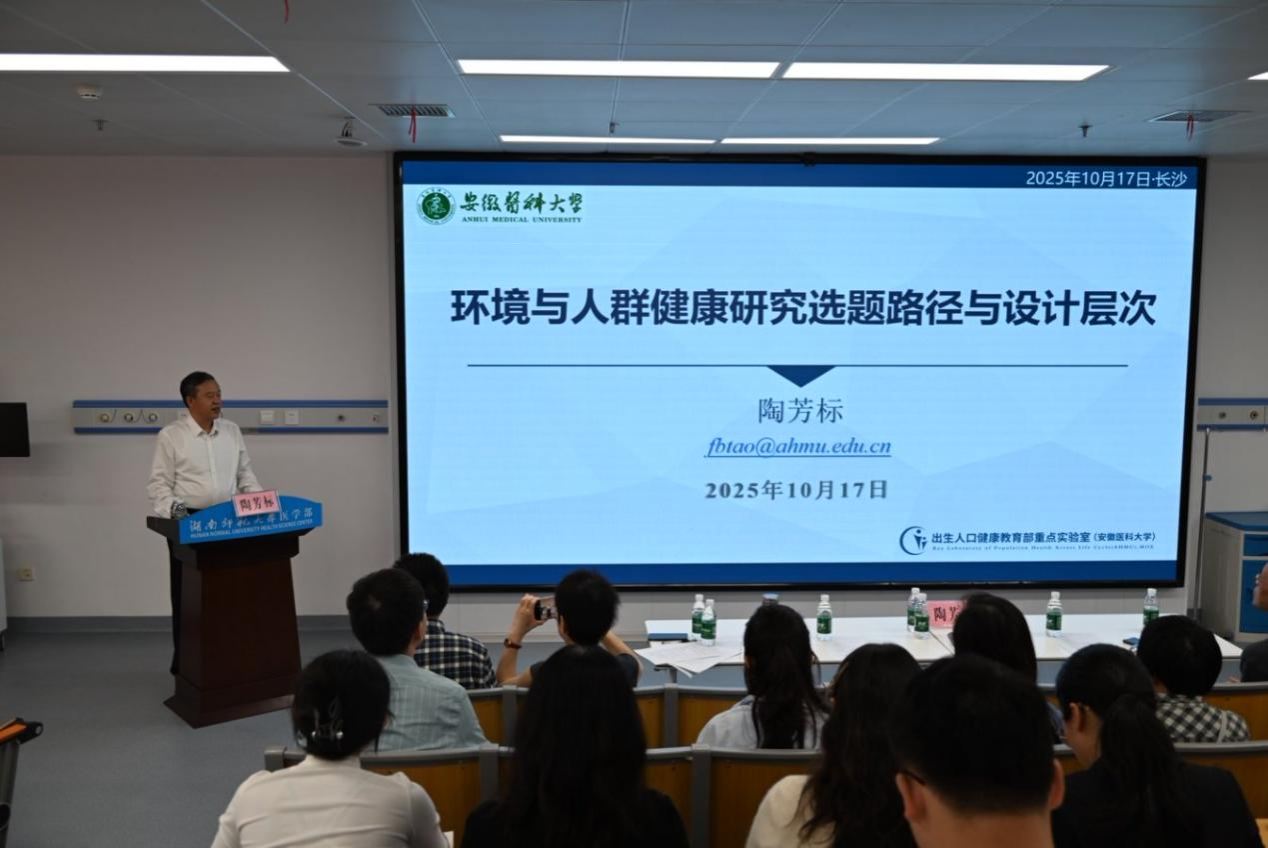 2025年10月17日,出生人口健康教育部重点实验室主任、安徽医科大学陶芳标教授应邀莅临WilliamHill(威廉希尔)官网,以“环境与人群健康研究选题路径与设计层次”为题,为师生带来了一场精彩纷呈的学术讲座。WilliamHill(威廉希尔)官网副主任、科技处处长彭小宁教授、公共卫生学院副院长徐坤教授、副院长陈适副教授、学位点负责人吕媛教授与百余名师生共同聆听。报告由徐坤教授主持。