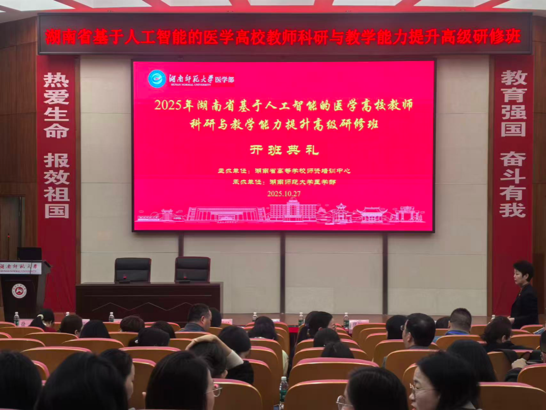 谢资清在致辞中指出,人工智能正以前所未有的力量重塑医学教育形态与科研路径。她强调,作为医学教育工作者,唯有主动拥抱技术、善用技术,才能真正肩负起培养新时代卓越医学人才的使命。她寄语全体学员:要争做“深度学习”的引领者,深入理解AI技术内核;要成为“跨界融合”的推动者,打破医学与信息科学之间的壁垒;更要成为“回归实践”的行动者,将研修所学转化为教学改革与科研突破的实际成果,为推动湖南省医学高等教育高质量发展注入智慧动能。