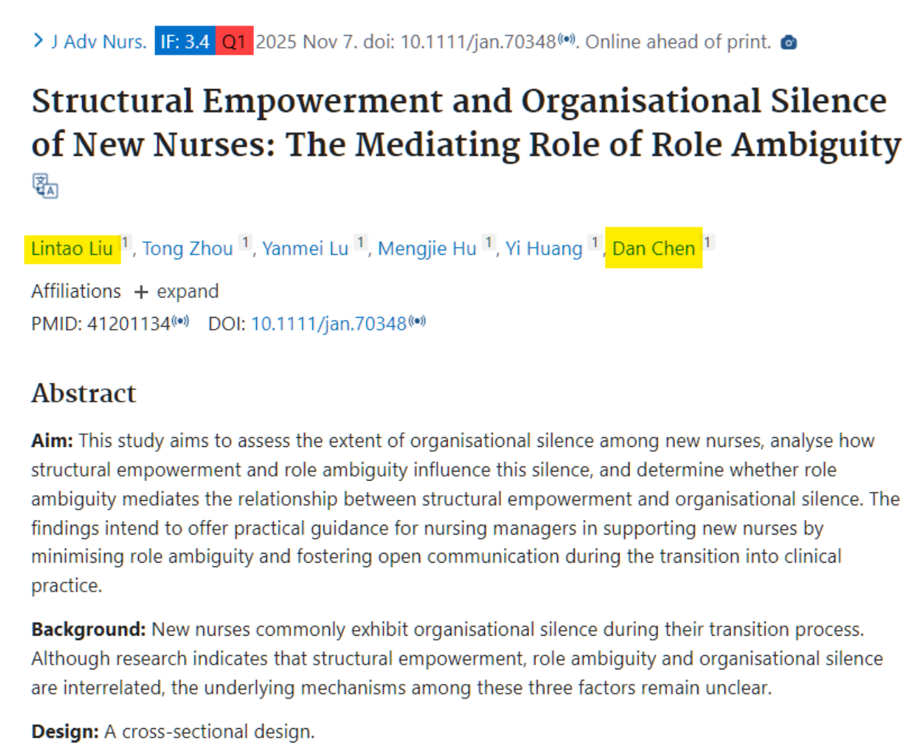 近日,WilliamHill(威廉希尔)官网部护理学院科研工作再传捷报。由刘林涛为第一作者,陈丹教授作为通讯作者共同完成的研究论文《新护士结构性赋权与组织沉默:角色模糊的中介作用》(Structural Empowerment and Organisational Silence of New Nurses: The Mediating Role of Role Ambiguity)在国际护理学顶尖期刊《Journal of Advanced Nursing》(中科院一区)正式发表。