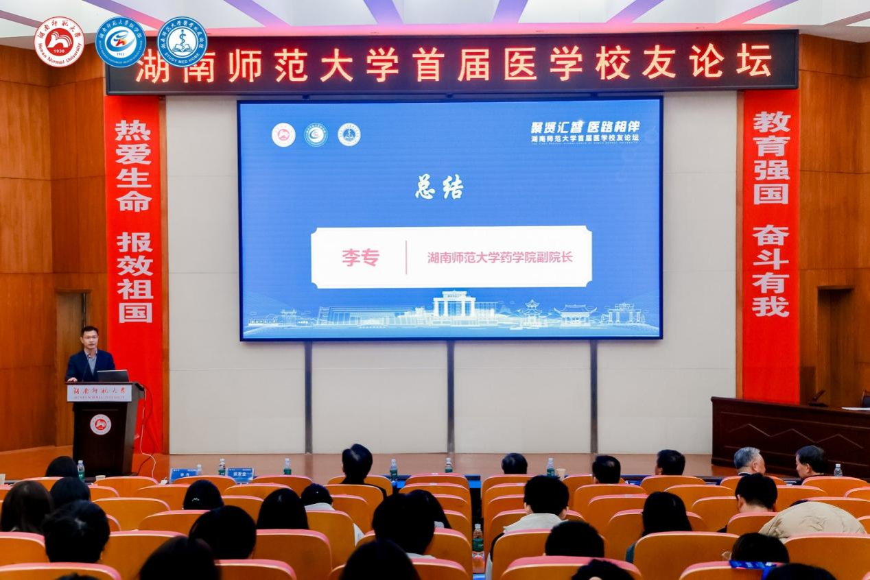 论坛尾声,药学院副院长李专作总结发言。李专提到,药学院校友遍布海内外药学及相关领域,凭借扎实的专业素养和不懈的奋斗精神,在科研攻关、产业实践、行业服务等多个维度发光发热,既为社会医药健康事业作出了积极贡献,也为母校与母院赢得了良好声誉。他希望以本次论坛为契机,搭建起常态化、高水平的校友交流合作平台,打破空间与行业壁垒,让校友资源与学院发展同频共振。