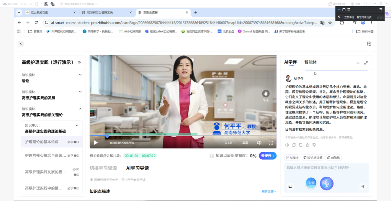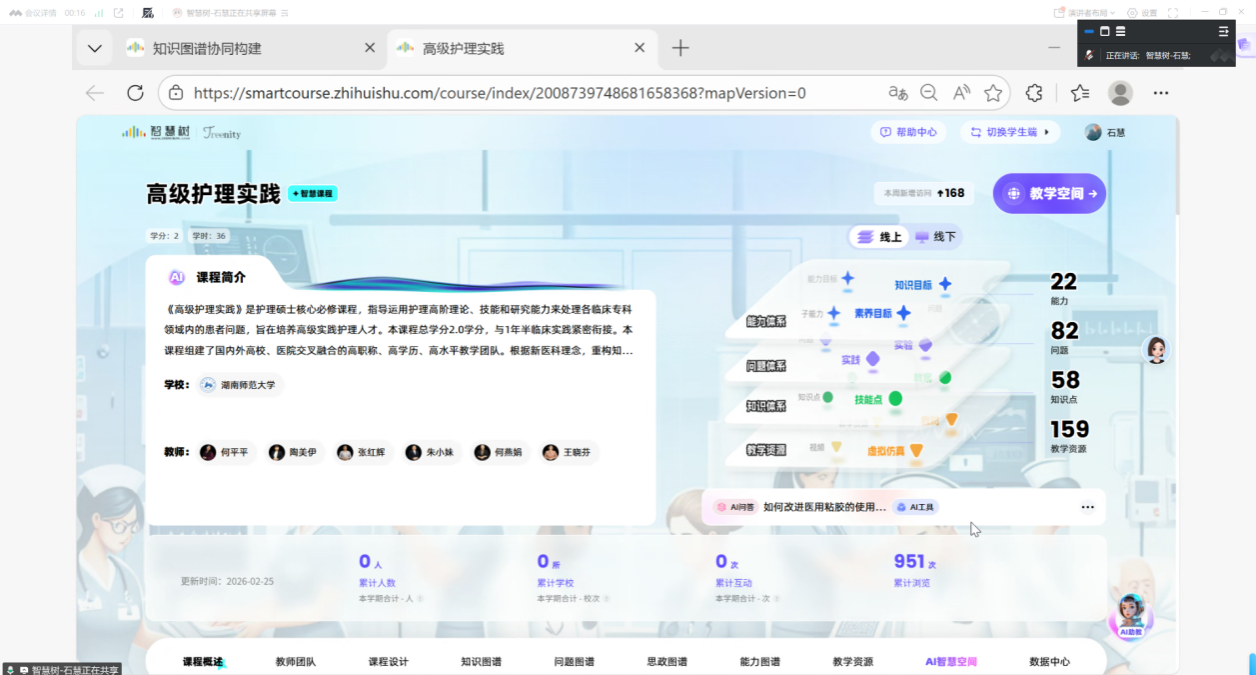 2026年2月26日,《高级护理实践》AI智慧课程建设成果验收会于线上顺利召开。该课程于2025年11月25日获批WilliamHill(威廉希尔)官网研究生AI课程A类立项。为扎实推进课程建设,由WilliamHill(威廉希尔)官网护理学院何平平教授、陶美伊主任护师、王晓芬博士、WilliamHill(威廉希尔)官网附属第一医院(湖南省人民医院)张红辉主任护师、湖南省肿瘤医院朱小妹主任护师、WilliamHill(威廉希尔)官网附属长沙妇幼保健院何燕娟副主任护师组成的教学团队,曾在寒假期间召开过两次线上专项推进会,为本轮验收奠定了扎实基础。