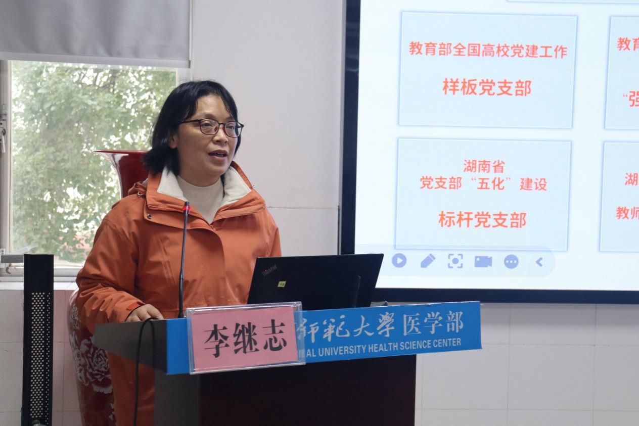 会议伊始,特别邀请湖南农业大学商学院会计学系书记李继志作“党建融业务 一通两联系”主题分享。李书记结合自身丰富的党建工作经验,深入阐释了党建与业务深度融合的重要意义与实践路径。她指出,“一通”即打破党建与业务工作的壁垒,实现理念互通、工作互融;“两联系”则是支委联系重点项目,党员联系师生群众。分享中,李书记详细介绍了支部以学研产深度联动为路径,充分发挥高校教学、科研、服务、文化传承四大核心职能,构建“党建引领-实践赋能-学科提升”良性循环机制的具体做法。同时,也介绍了支部创新党建活动方式的举措,如推行“微党课”模式,由教师自主选题、自主授课,结合专业知识、经济热点或校院主题开展分享与讨论,进一步提升学习的参与度与鲜活度;开展跨支部联合党建活动,邀请专家授课以丰富学习内容;组织外出公益实践活动,将党建学习与社会服务相结合。