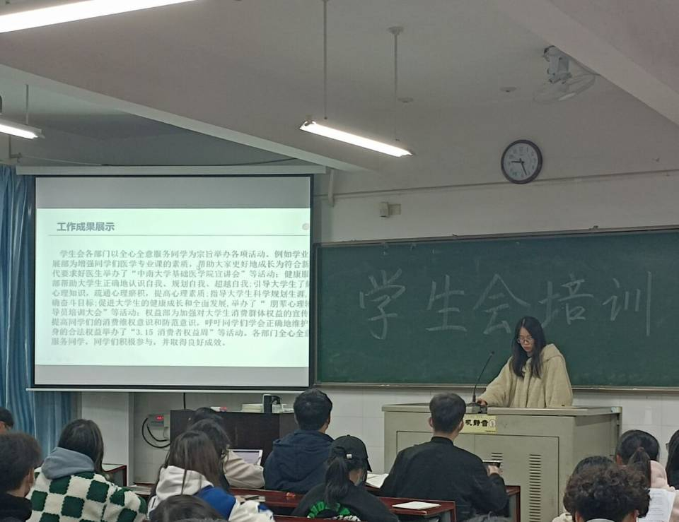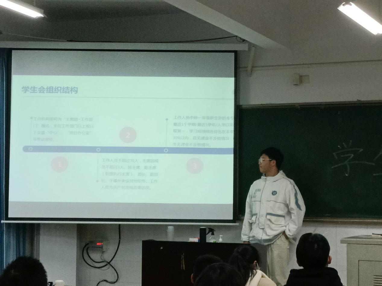 培训由学生会执行主席邓云帆主讲。邓云帆首先从“主席团与工作部门”的工作组织结构、“全心全意为同学服务”工作理念与工作思想三个方面进行了对高校学生会组织进行了介绍,并重点对高校学生会组织结构、工作思想两方面进行了讲解培训。