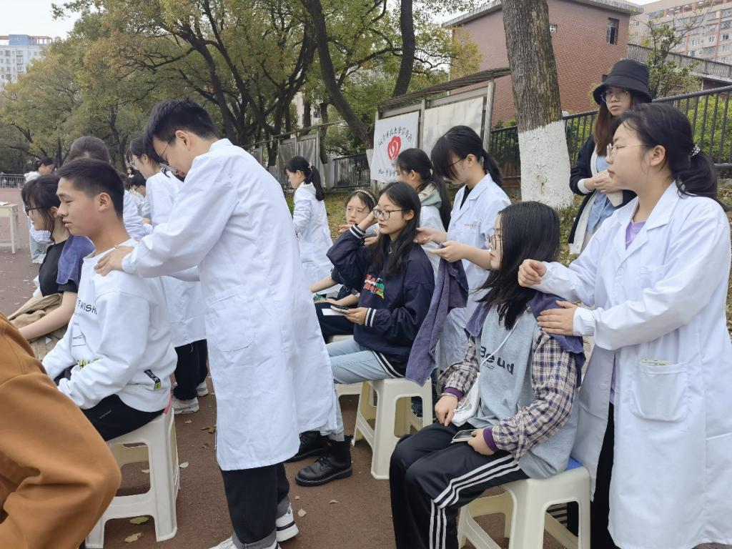 在田径场举办的活动“你画我猜“、医学拼图、茶艺大赛、趣踩气球、找茬能手等趣味项目如火如荼地开展着,吸引了很多同学前来探索体验。同时,与健康咨询队联合举办的校园义诊,与医学社推拿队合办的中医推拿也有条不紊地进行着,同学纷纷前往咨询、了解自己身体状况,体验健康养生之道。此次线下活动持续到下午四时。