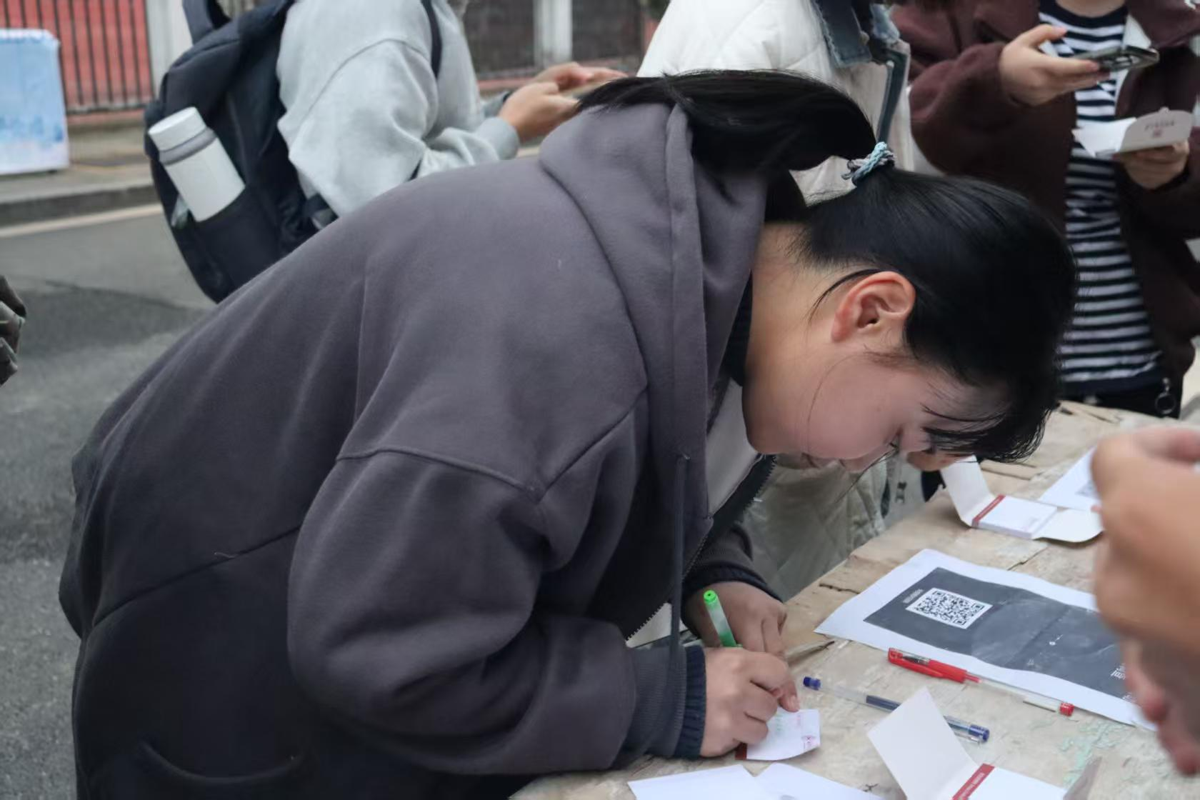活动现场,主干道的展板前人头攒动;视角推近,摆桌前同学躬身作答。从白天到黑夜,一个又一个同学拿起笔写下自己的回答与困惑,一起接续这股秋日的温情,传承这份秋日的文化。有人接过关于"秋日传统习俗"的问题,提笔写下"重阳登高、秋分祭月"的答案;有人留下"你心中的秋日校园美景是什么"的新问,引来了后续参与者的积极回应。一张张便利贴,既承载着对传统文化的理解,也传递着校园生活的温情共鸣。