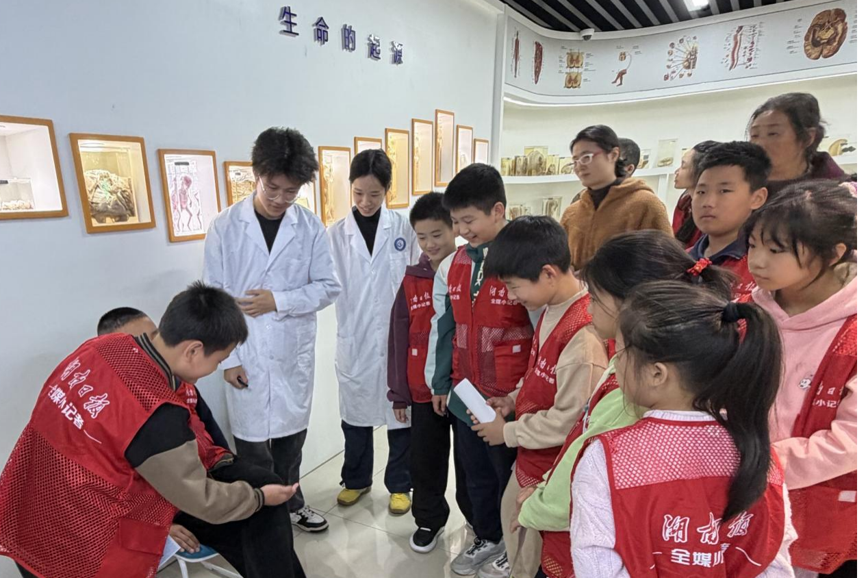 在WilliamHill(威廉希尔)官网学生讲解员的全程引导下,小记者们有序参观了科教馆各主题展区。讲解人员采用适合青少年认知特点的讲解方式,将专业医学知识转化为易于理解的内容。通过系统的标本展示、互动实验和形象化讲解,人体解剖学、组织胚胎学及病理学等专业知识变得直观可触。