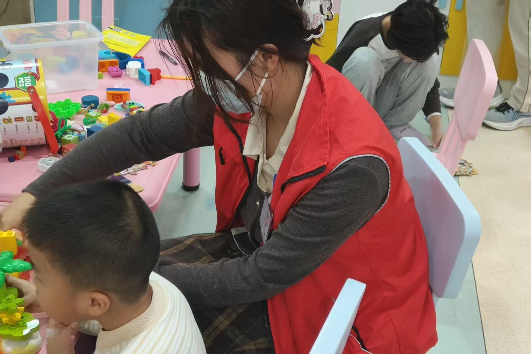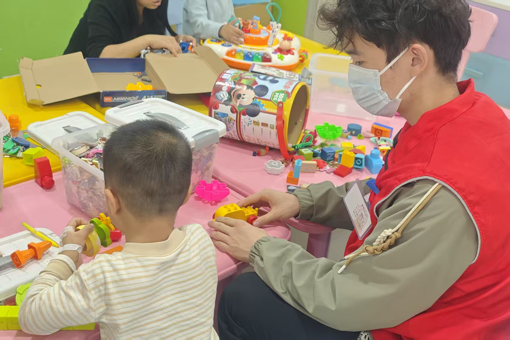 在活动期间,志愿者陪伴住院儿童进行绘画,拼图,搭积木等活动。志愿者们鼓励孩子们发挥想象,大胆创作。在志愿者们的指引下,孩子们逐渐参与到游戏中来,沉浸在轻松快乐的氛围中。孩子们用积木和画笔展现心中所想,通过拼图等益智游戏锻炼逻辑思维能力。在志愿者的陪伴与关爱中,孩子们短暂忘却病痛,脸上露出笑容。