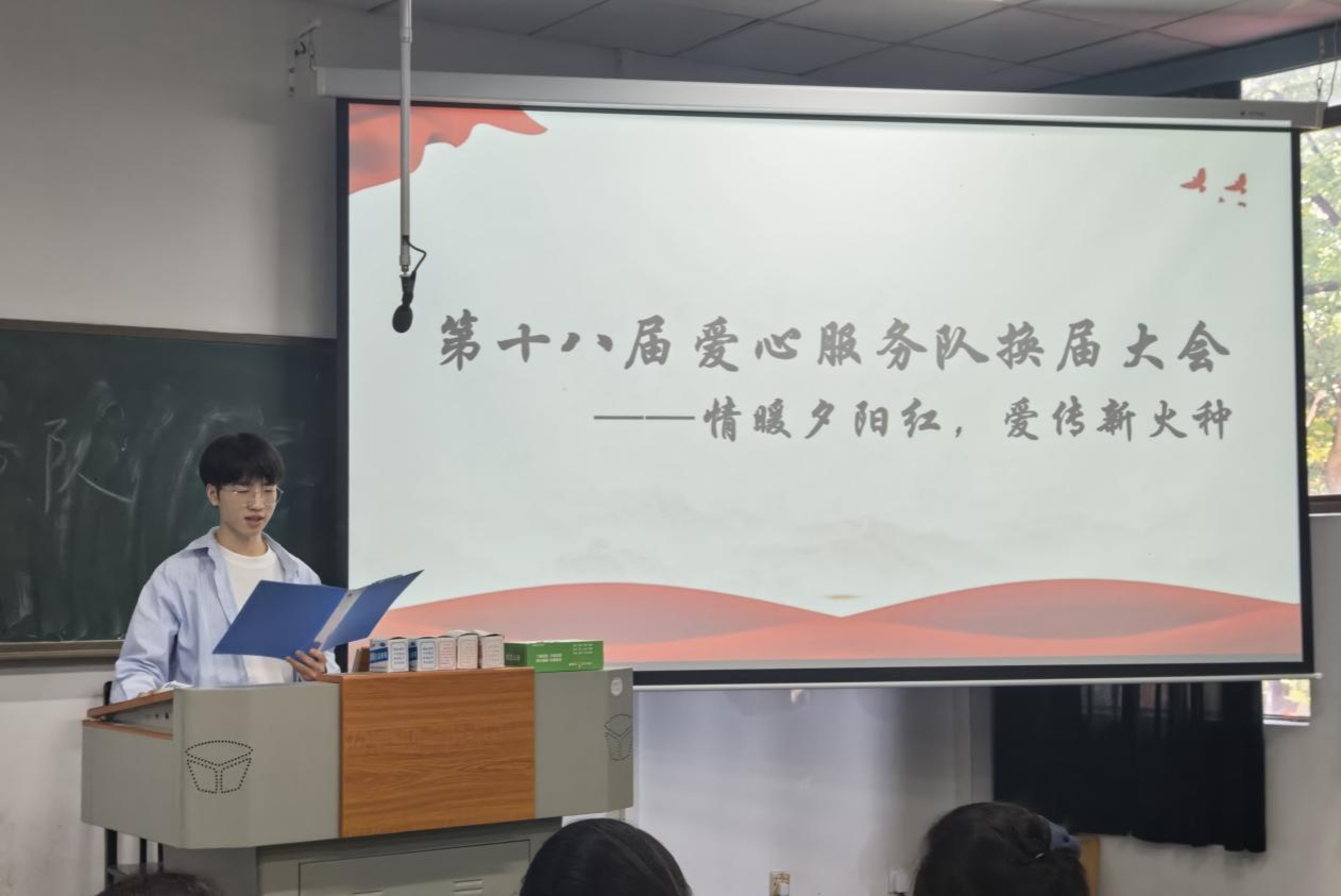 大会首先邀请部团委学生副书记兼红十字会秘书长李宣萱致辞,她在发言中充分肯定了服务队过去的工作成效,并对未来发展提出了明确方向,鼓励全体队员坚守初心、锤炼本领,在志愿服务中持续发光发热。随后,第十七届爱心服务队队长罗静回顾了过去一年的团队成长历程,分享志愿服务的经验与感悟,向新一届队员传递了服务理念与团队精神。在仪式环节,李宣萱为新一届骨干成员颁发聘书,明确其职责身份。而后,新老队长完成授旗仪式,助力团队共识凝聚。