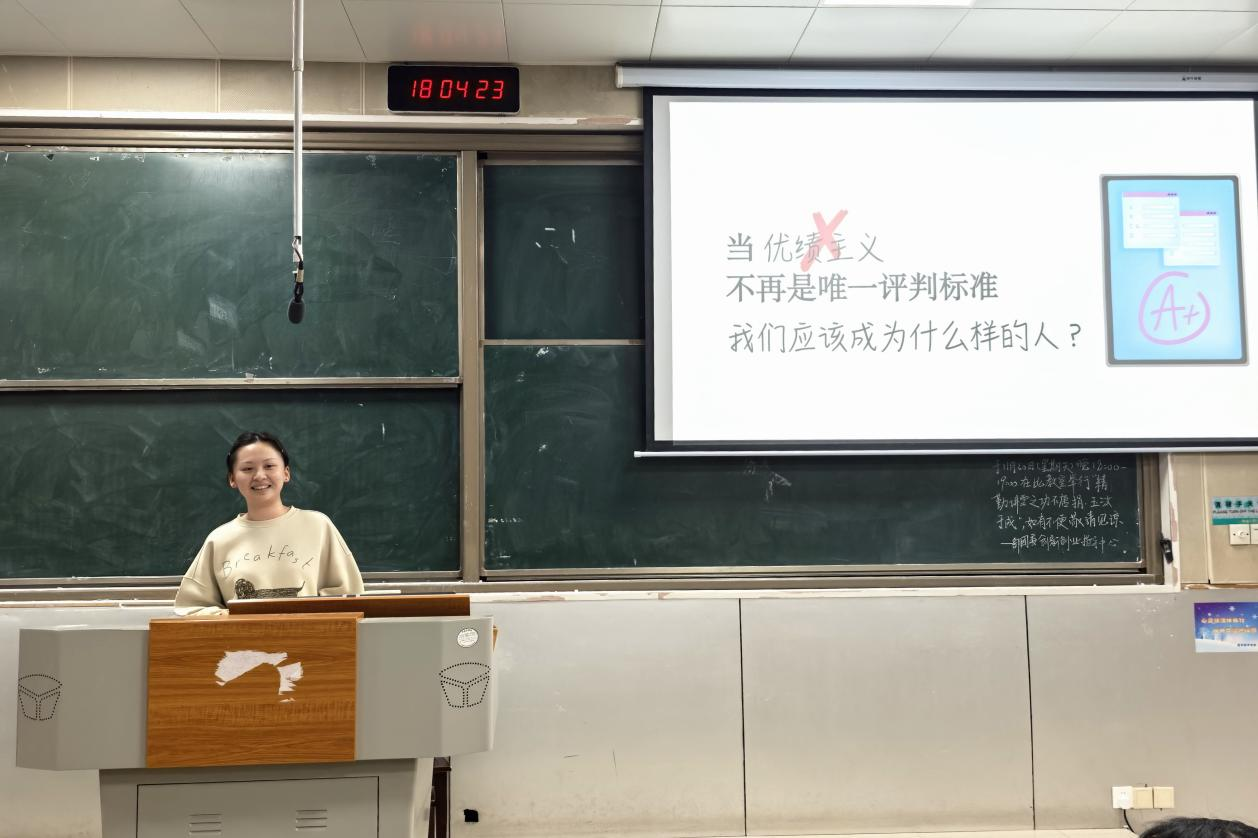 胡若扬结合自身科研与竞赛经历,号召同学们专注学业、主动参与科学研究。她分享了自身长期参与科研项目、牵头开展创新创业训练计划的实践过程,结合所获多项省级、国家级竞赛奖项,剖析科研训练与个人能力提升的内在关联,指出扎实的过程积累与清晰的成果呈现同等重要。此外,她还围绕“当优绩主义不再是唯一评判标准,如何让自身优秀被看见”这一问题分享见解,鼓励同学们勇敢尝试、不惧犯错,学会正确应对压力,主动突破自我。