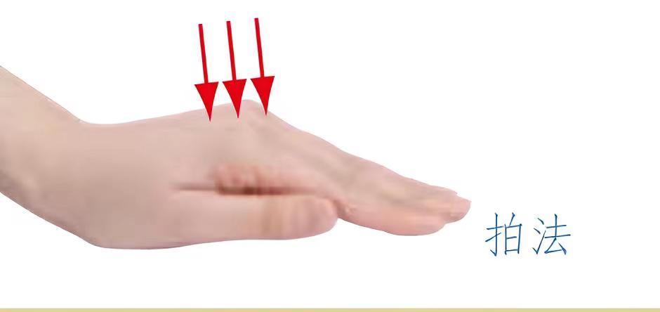 拍法的动作要领为,五指并拢,掌指关节微屈,使掌心空虚形成空腔。大拇指贴于食指第二指关节,手腕关节放松,小臂发力,上下挥臂,平稳而有节奏地用虚掌拍打肌肉部位。若用双掌拍打,两手交替操作,指先落,腕后落;腕先抬,指后抬。