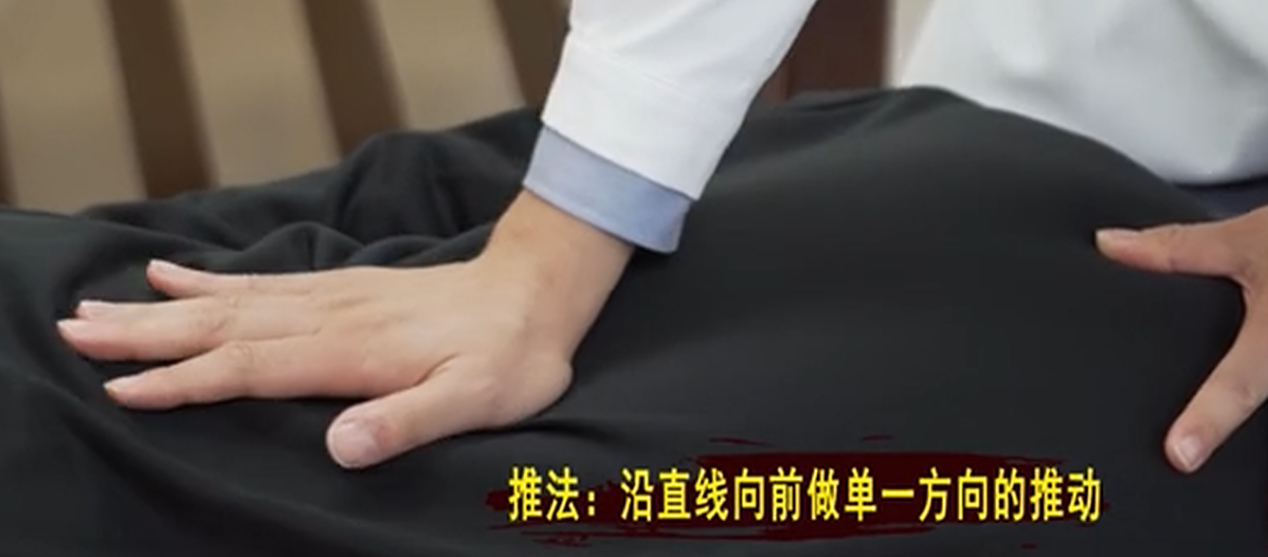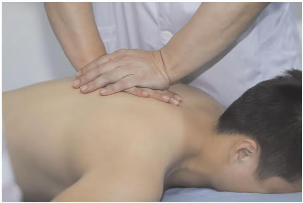 手臂伸直,五指自然伸直,腕关节略背伸,掌跟斜压竖脊肌起点,以肩关节为支点,上肢主动施力,均匀推下至腰部手掌撑开,使掌根部向前方做单方向直线推进。