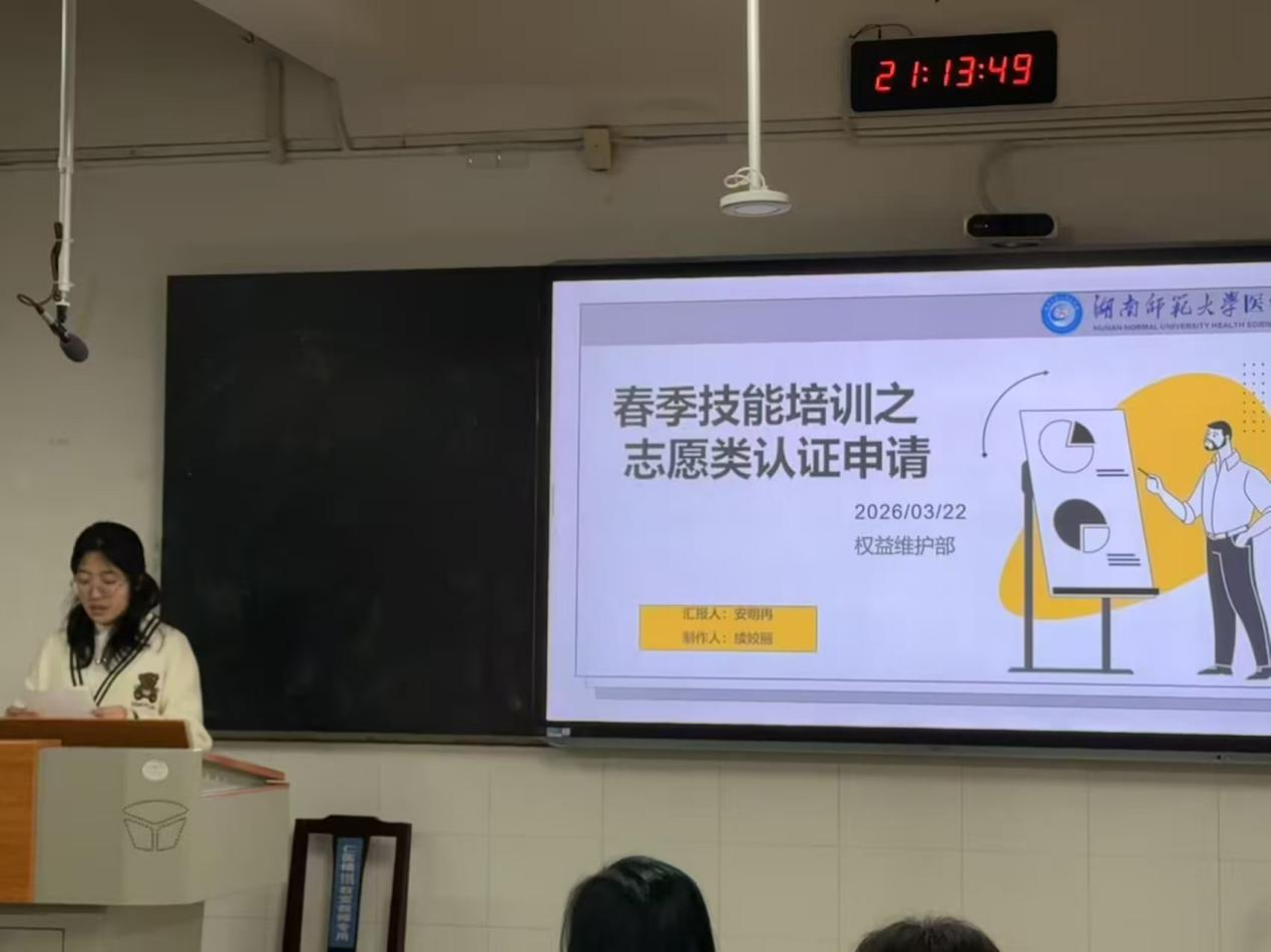 会议伊始,办公室志愿者张宸玮同学进行点名,确认全体成员准时参会。随后,权益维护部志愿者安明冉同学围绕“志愿类认证申请”主题开展春季技能培训。她从活动前“申请”、活动中“留痕”、活动后“总结”三个环节入手,系统梳理了志愿时长认证的全流程规范,帮助学生会成员们进一步明晰志愿活动的组织要求与操作细则。