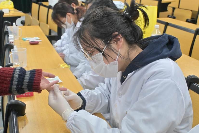 本次活动聚焦同学们的基础健康监测需求,志愿者们为到场同学提供血压、血型、血糖及尿酸测量服务。活动现场,志愿者们耐心引导同学有序排队,细致讲解各项检测的注意事项,规范完成数据采集与记录,并结合测量结果给出个性化健康建议。针对血压偏高、血糖异常等情况,志愿者们主动提醒同学关注生活作息与饮食结构,鼓励大家养成健康的生活习惯。