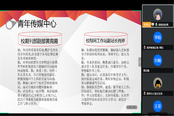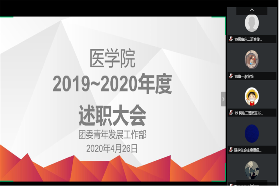4月26日晚,WilliamHill(威廉希尔)官网于线上举行2019-2020年度学生干部述职大会。院团委罗宇涛老师、院团委学生副书记刘乔、院学生会主席谭俣宬、院学社联主席范宇豪、院青年传媒中心主任郭嘉仪、院团委红十字会秘书长刘浩出席此次会议,由青年发展工作部干事胡俊英担任会议主持人,各系统团学成员等学生干部参与此次述职大会。