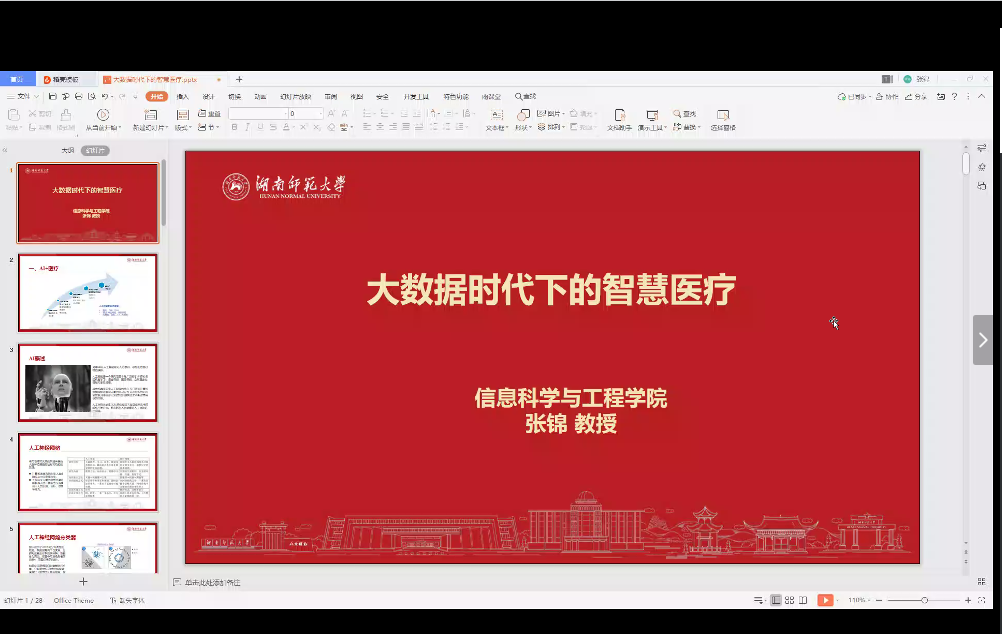 张锦教授先从大数据时代中智能AI在生活中的应用切入主题,以小孩认识事物的过程为例,生动浅显地讲述了AI学习模式,引出了我国人工智能发展中“人口多”的有利条件,并例举了智能AI将来在医学上使用前景。在讲座过程中,张锦教授还播放了科学动画,来告诉同学们现在智能AI在生活生产上的应用,启迪同学们作为当代大学生在智能AI逐渐发展的时代需要培养的能力。最后张锦教授向大家分享了智能AI在医学上的应用。