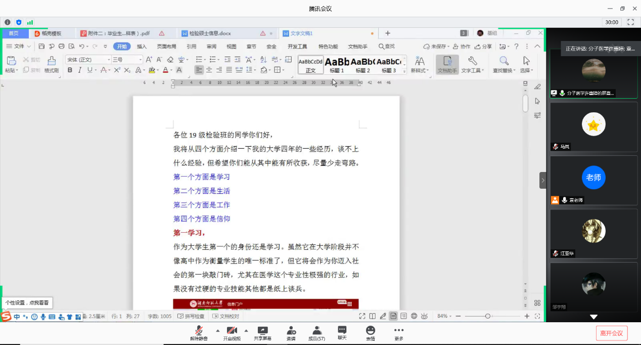 6月10日晚7点30分,2019级检验班大学学习和考研经验交流会在线上顺利举行。此次交流会由班导师袁仕善组织,2020届检验班四名考研成功的学姐和2019级检验班全体学生参加。