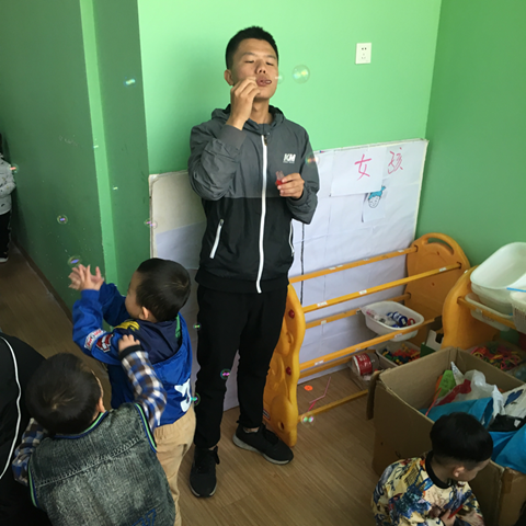 自闭症儿童一般不会主动和别人说话如果要和他们沟通,需要先取得他们的信任。因此,志愿者们蹲下来和他们的目光水平,注视着他们的眼睛让孩子们更有意识的和他们沟通交流。在安抚孩子们情绪的过程中,志愿者们发现他们有什么地方做的不对,耐心劝说,细心指导,待孩子们情绪平和之后再说明其中的原因和道理。在与自闭症儿童接触时,志愿者们与孩子玩起了事先准备好的游戏。当活动室里浮动起各种大小的泡泡,每个孩子都露出了笑容。