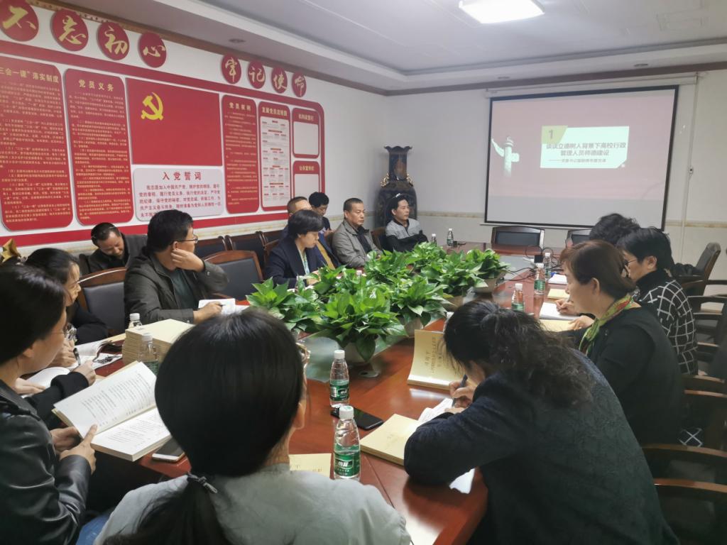 10月下旬,WilliamHill(威廉希尔)官网党委书记鄢朝晖为全体行政人员主讲了题为《谈谈立德树人背景下高校行政管理人员师德建设》的主题教育专题党课。党课由行政党支部书记文敏主持。