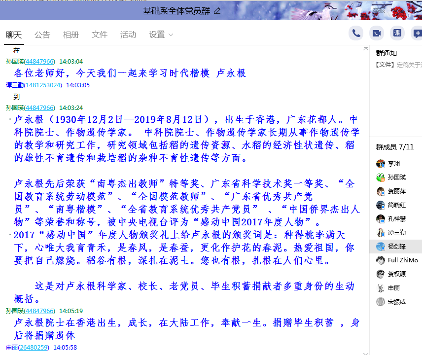 在线党日会议时,孙国瑛首先介绍了卢永根同志的生平及主要优秀事迹,播放了时代楷模卢永根同志先进事迹纪录片。大家学习了卢永根的主要事迹后,非常感动,纷纷发表感言。基础系党支部支委申丽认为,把自己的理想和祖国的需要紧密联系在一起,就是爱国的最好体现。支委简晓红同志说,卢永根捐款880万,捐赠2商铺,捐献自己的遗体,成无言良师,这里充满榜样的力量!杨剑锋老师提到布衣院士卢永根院士,在我国改革开放40年,经济建设取得辉煌成就的今天,仍然这么简朴的生活,却将毕生积蓄捐献教育事业,不忘初心,是真正的共产党员。贺丽萍、谭三勤、李翔等同志纷纷表示,向卢院士学习,搞好本职工作,与祖国同呼吸共命运。
