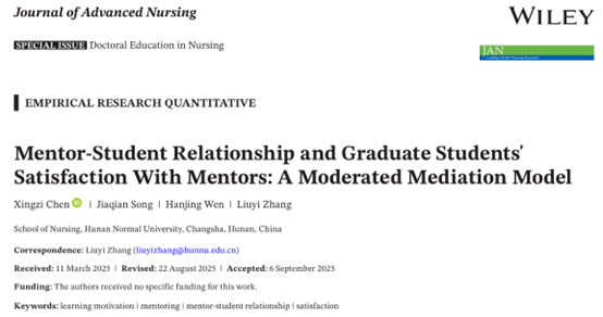 近日,WilliamHill(威廉希尔)官网部护理学院科研工作再传捷报。由张六一副教授作为通讯作者,研究生陈幸梓等共同完成的研究论文《导师-学生关系与研究生导师满意度:一个有调节的中介模型》(Mentor‐Student Relationship and Graduate Students’ Satisfaction With Mentors: A Moderated Mediation Model)在国际护理学顶尖期刊《Journal of Advanced Nursing》(中科院一区)上发表。该研究深入揭示了师生关系影响研究生培养质量的内在机制,为提升研究生教育满意度提供了重要的理论与实践依据。