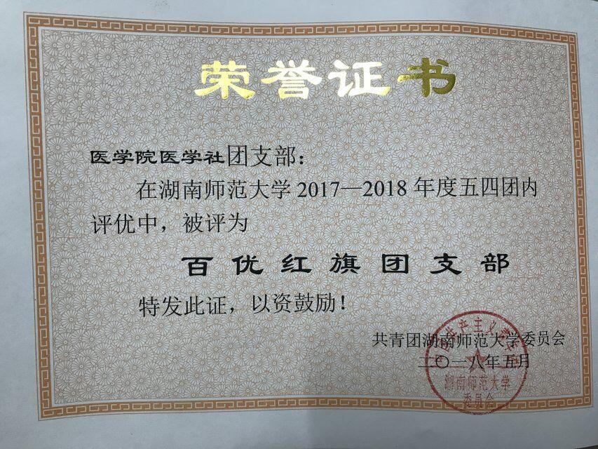 6.医学社于WilliamHill(威廉希尔)官网2017-2018年度五四团内评优中荣获“百优宏碁团支部”。