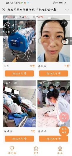 活动以线上评选的方式进行,向参赛者征集医护人员照片,后将照片统一公示,由大众投票决出照片定格的最美瞬间。学生们十分积极响应此次活动,仅15日全天投稿的人数就已经超出预计参加活动的总人数。在参赛照片中许多场景让人动容,有满脸疲惫布满勒痕却面带笑容画面,有与病患相互鼓励的画面。