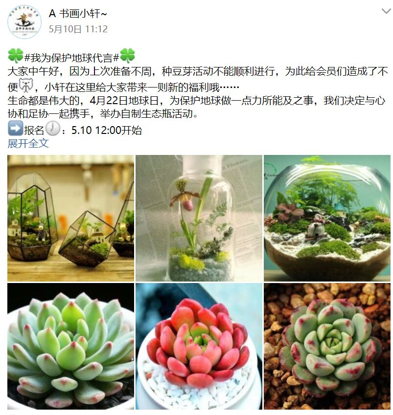 此次活动由参加活动的成员自行制作生态瓶,并将作品照片通过线上方式进行评比。所谓生态瓶,即是把一些小动物、植物放入一个透明密闭玻璃瓶中,不放任何食物,不开瓶,生物皆能生存的人工微型生态系统。活动照片展现出学生们充分发挥自己的想象力,将泥沙放入玻璃瓶中,发上水草,灌入清水,搭配上小鱼小虾等水生生物,制作出各具特色生态瓶。活动选取了十位同学的优秀作品进行公示,送上绿色植物一份。
