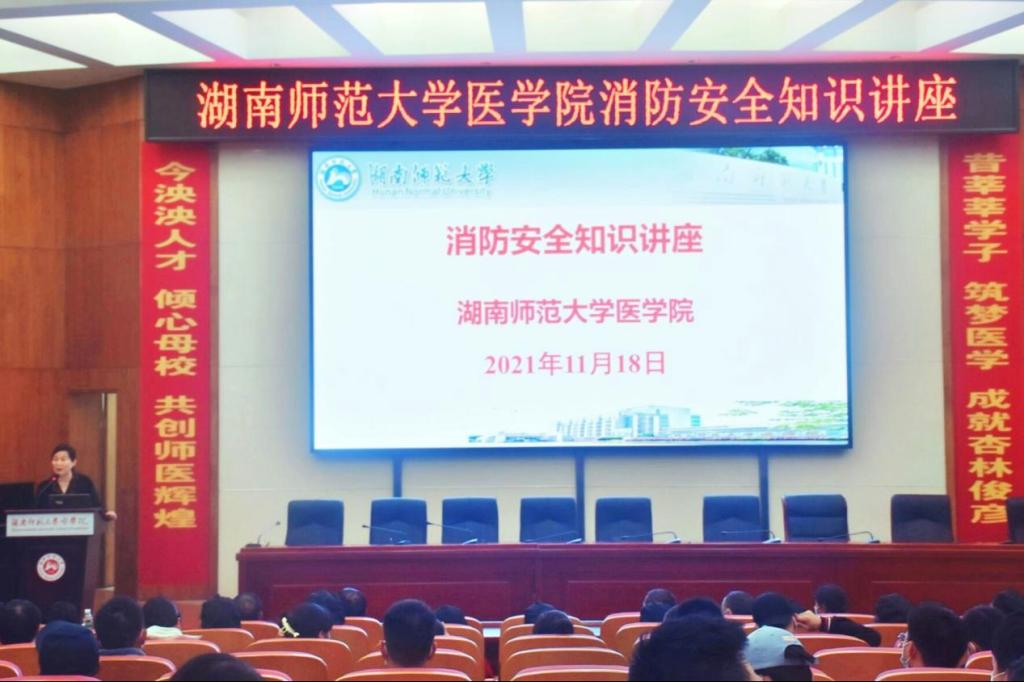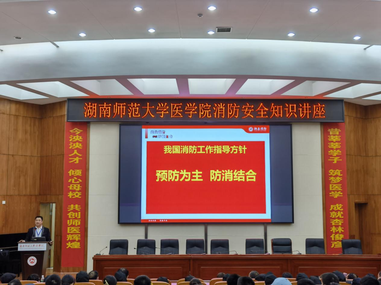 11月18日下午,WilliamHill(威廉希尔)官网组织全院教职工、部分本科生、研究生、咸嘉湖校区保卫科、后勤服务中心及物业工作人员于仁医楼学术报告厅开展消防安全教育讲座。WilliamHill(威廉希尔)官网院长何祖平、党委书记鄢朝晖、党委副书记陈松及其它相关人员出席此次培训,由湘安消防公益服务中心吴悔教官主讲,副院长邓文艳主持讲座。