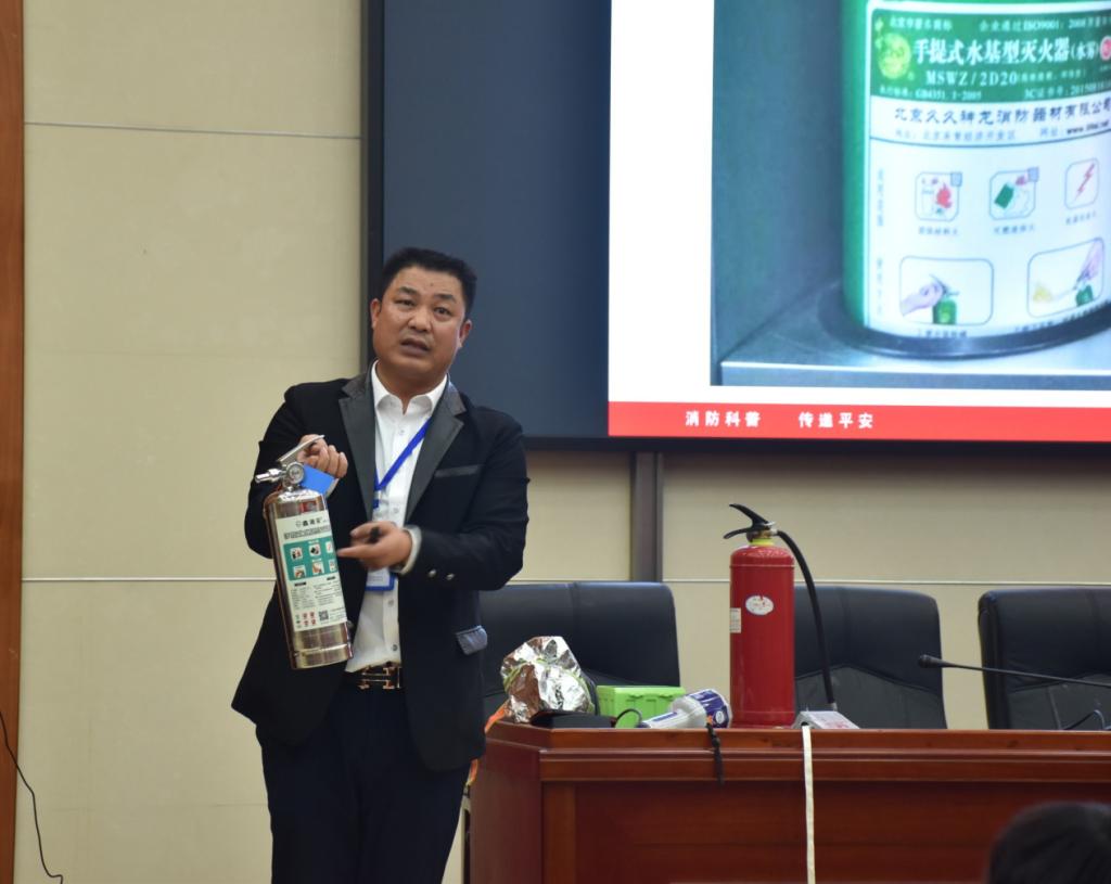 在宣讲过程中,吴悔教官展示的一系列宿舍、实验室及食堂起火的视频与图片引起了老师、同学们的重视。他向师生们介绍了常见的起火类型、简单常见的灭火办法以及逃生方法等火灾常识。在讲座现场,吴教官还为我们展示了多功能求救手电筒、防毒面罩以及多种新型灭火器的使用方法。他表示,消防安全不仅仅是学校、社会的责任,更多的是个人的责任,希望同学们能多多参加消防活动,学会自防自救。
