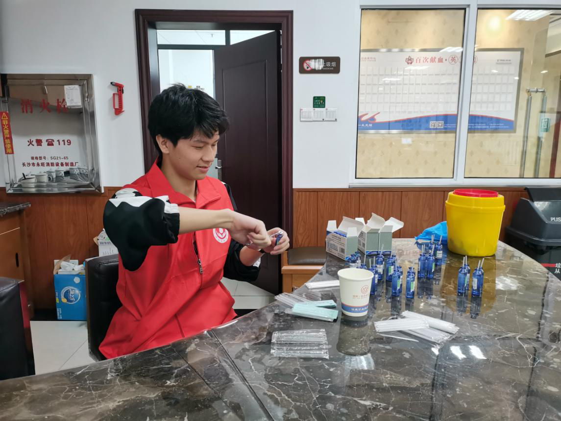 在活动负责人葛敏和王荣的带领下,志愿者们依次到达长沙血液中心。志愿者们用完餐后前往三楼准备献血。无偿献血宣传服务队的队员们在各个岗位上分好工,有序安排志愿者们进行填表登记、血液检测、献血前准备等流程。血液中心为大家准备了零食和饮料,安抚大家在等待时焦虑的心情。在献血的时候,护士姐姐们向大家讲述有关血液的知识和宣传无偿献血的精神,并提醒大家献完血后应该注意的事项。