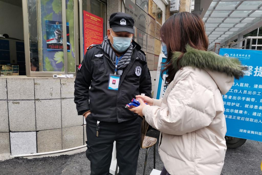 来到湖南省胸科医院门口,志愿者们走到了保安亭旁,向执勤的保安们送去感谢以及温暖,保安热情地感谢了志愿者们,并与志愿者们聊起了家常。