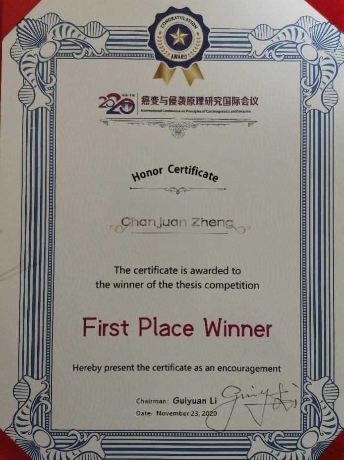 2020年癌变与侵袭原理研究国际会议青年论坛一等奖(郑婵娟,指导老师:邓锡云教授)