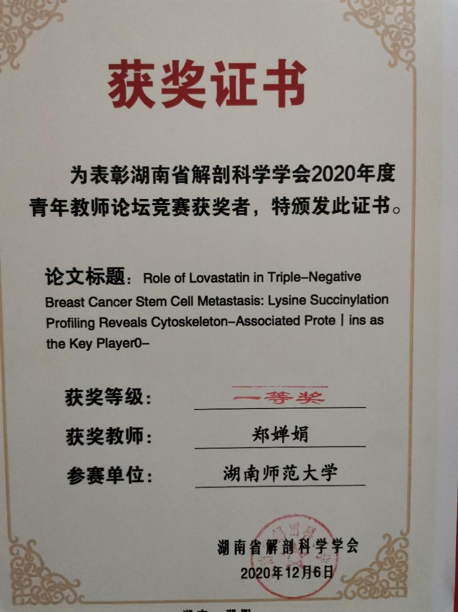 2020年湖南省解剖科学学会青年论坛一等奖(郑婵娟,指导老师:邓锡云教授)