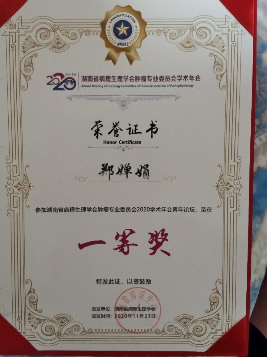 2020年湖南省病理生理学会肿瘤学术年会青年论坛一等奖(郑婵娟,指导老师:邓锡云教授)