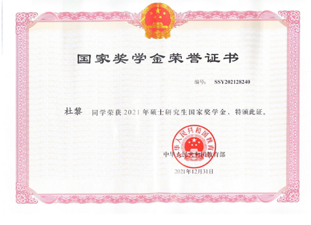 2021年度国家奖学金获奖(杜黎,指导老师:何祖平教授)